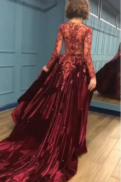 Eartha Classical Burgundy V-Neck Long Sleeves Appliques Velvet Sheath Prom Dresses With Panel Train
